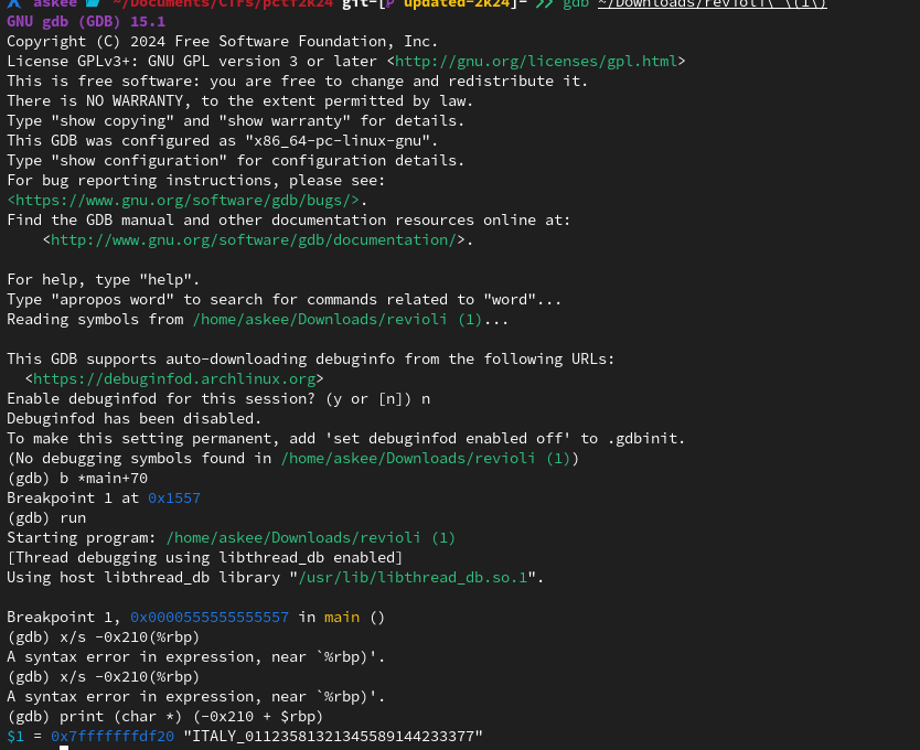 Well, I opened the binary in Cutter and understood the assignment immediately. I had to get the flag after it’s assembled in assemble_flag function. So I put a break point and printed the returned result of the function with GDB.